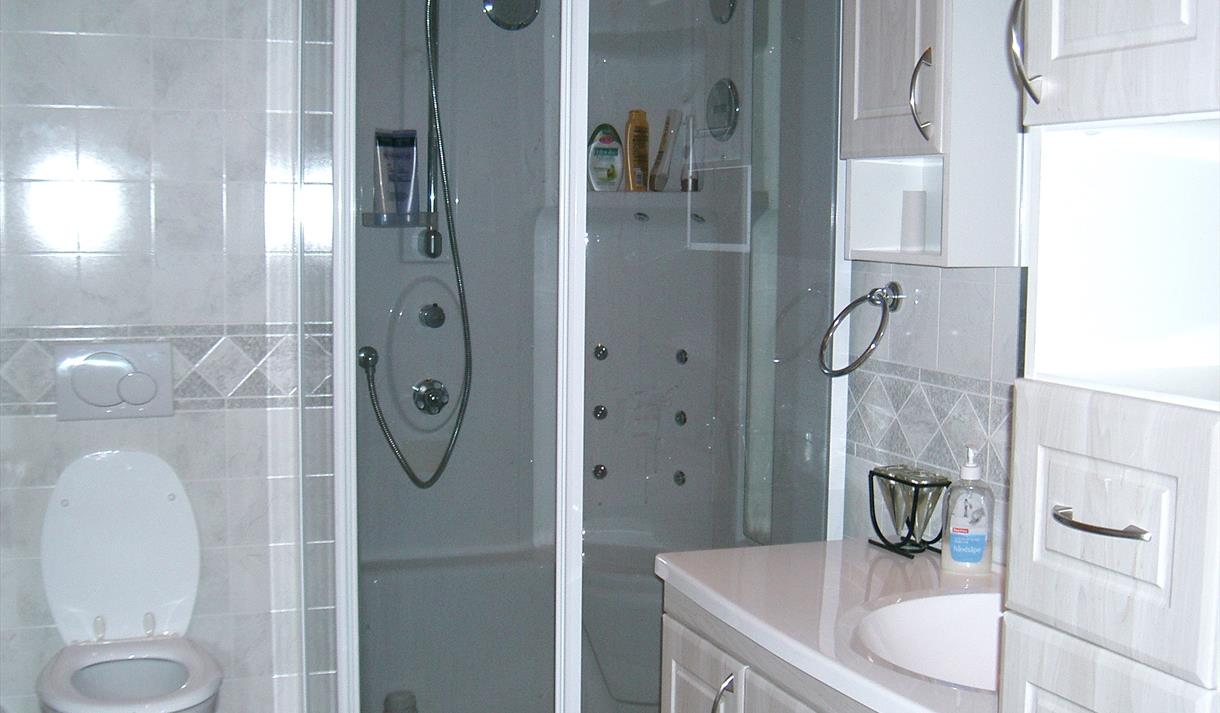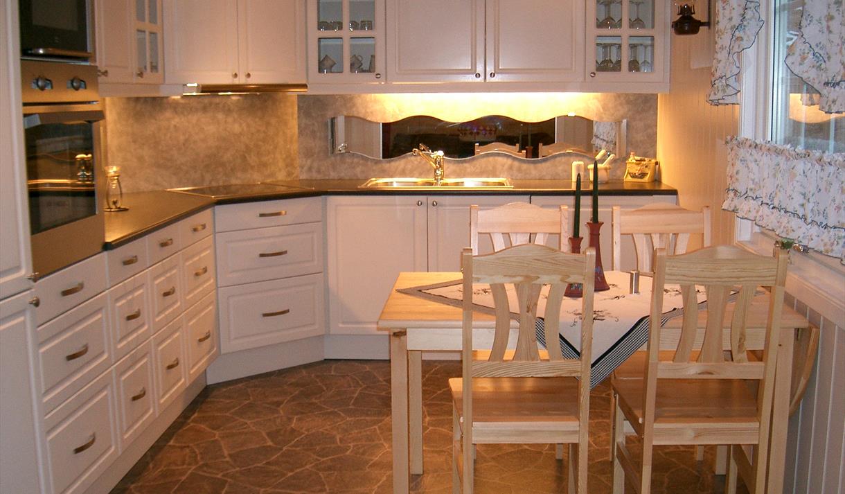 Kjøkken, dusj og toalett.